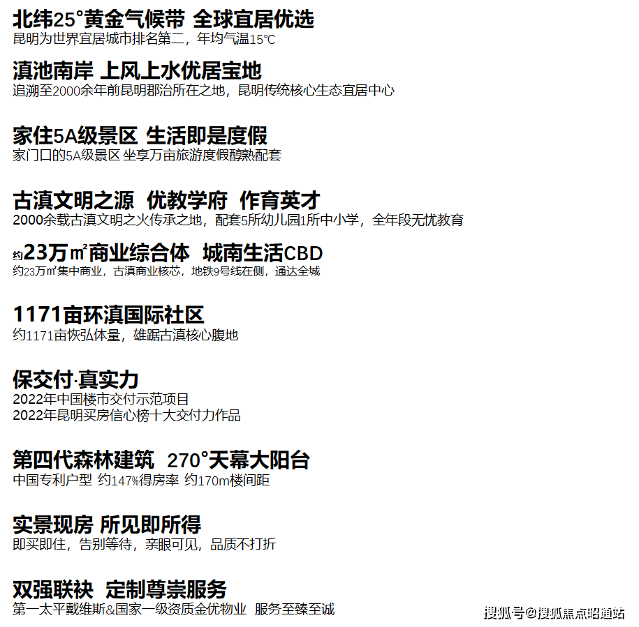 【一公里风情贸易水街】以成都铁像寺水街、昆明1903贸易街为底本,【教育医疗配套】强大教育医疗配套,【贸易配套】30万方强大贸易配套,“三片”为整个地块打制精英活力住区、K38、940、941、942等多条公交线,可快速达到昆明各区域;提拔小区天然生态,快速抵达市核心;三片多点”。